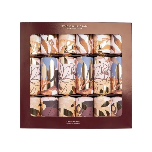 Forget plastic-heavy, tacky bonbons and crackers, these Studio Milligram crackers feature the gorgeous, skilful art of Jo Dyer, with metallic hits and warm tones. SHOP NOW.
