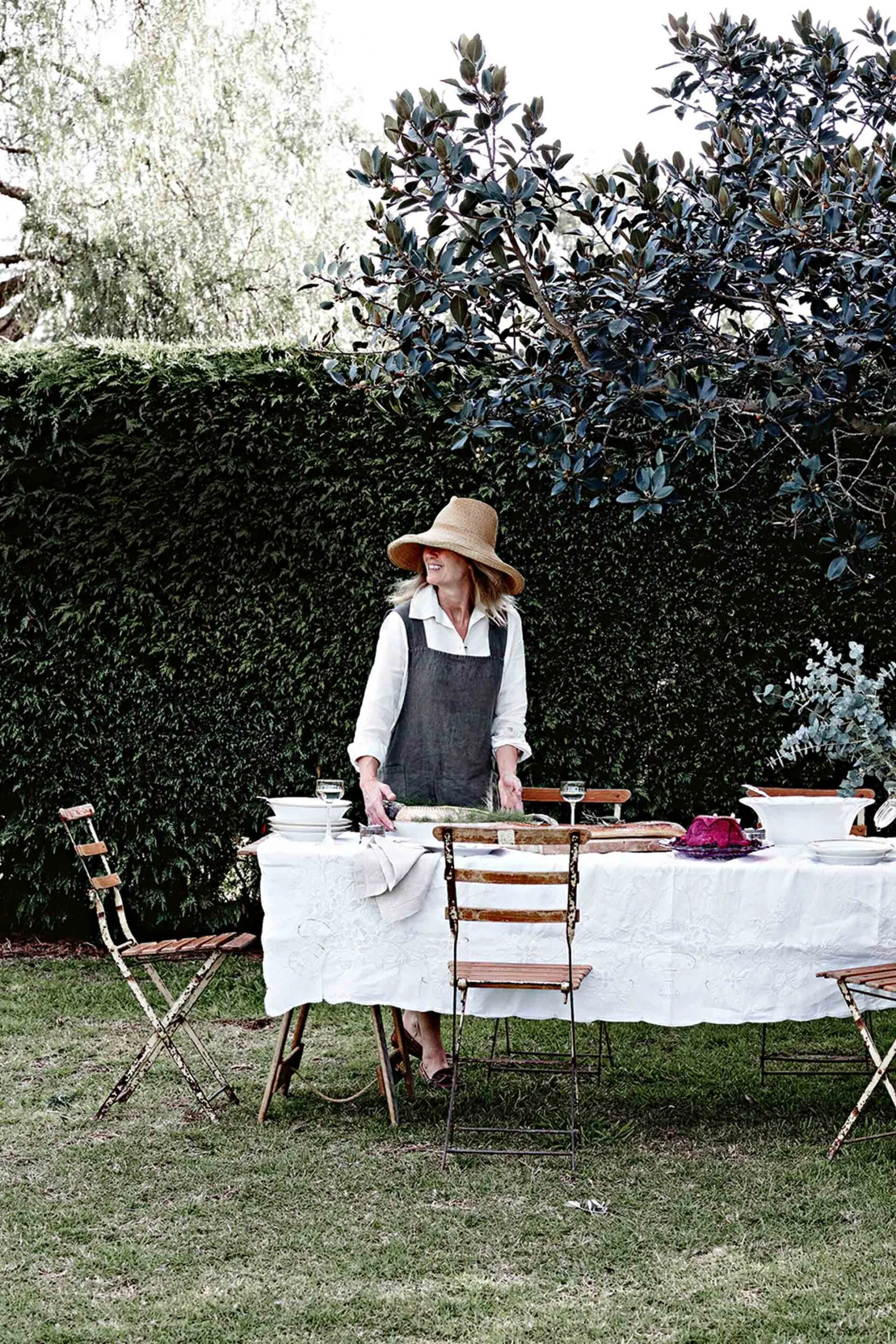 Sheltered by the tall hedge of Leyland cypress, Mickey Robertson sets a table in her Camden garden under a Port Jackson fig.