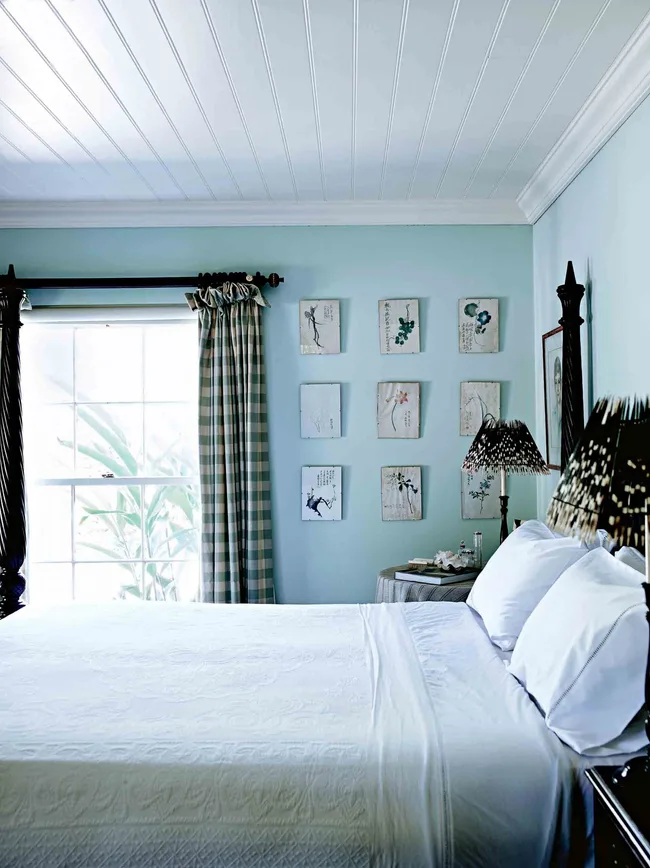 Chinese botanical paintings line the bedroom walls, which are painted a custom-mixed colour. “I’m always marrying the sea and the garden, and that’s just in here,” she says. “I repeat this throughout the house.”