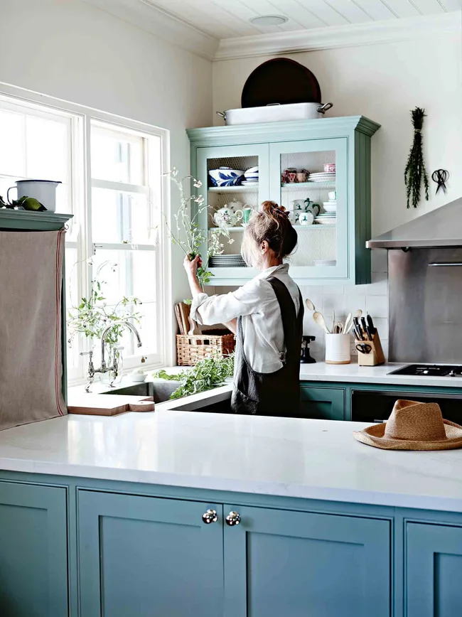 Mickey’s painter custom mixed the colour for the kitchen cabinets, while the benchtops are Caesarstone. “The window looks towards the old stables, pool and hills, so it’s easy to get distracted,” Mickey says. The Robertsons were living in Sydney’s eastern suburbs, and it was from there that they travelled while making the sandstone house habitable.