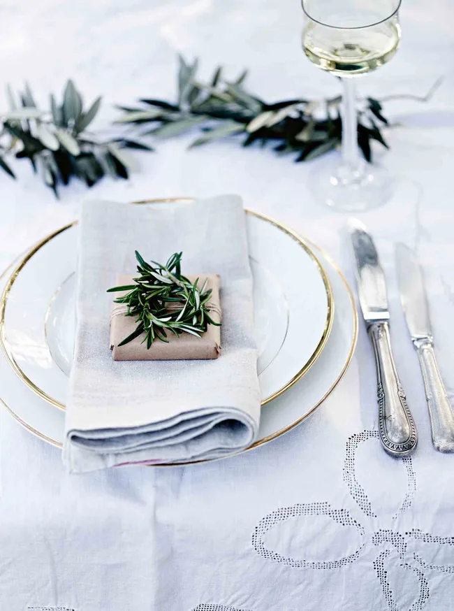 Tiny rosemary wreaths make a festive place setting. The couple knew when they bought the property that it would have to fund itself. For many years they hosted weddings, and the footprint of the original dairy was taken as a guide to build a sturdy replacement to host events and workshops, while the original separating shed has been converted to a kitchen. Mickey now prefers to focus on the simplicity and intimacy of her garden events.