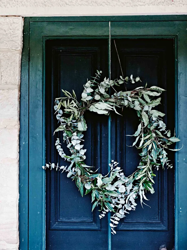 A festive eucalypt wreath on the front door. “Decorate your doors with wreaths made from foraged foliage collected in the garden or even from the roadside,” says Mickey.