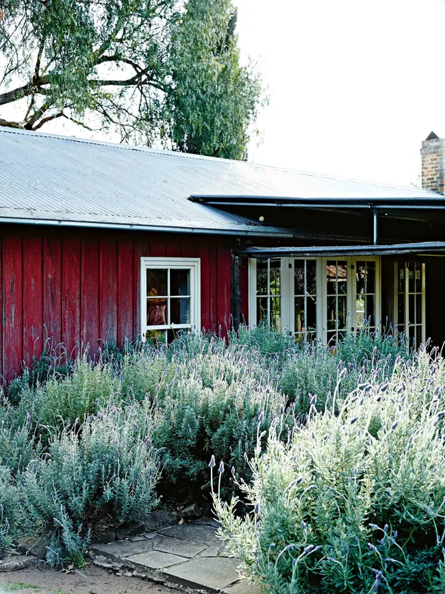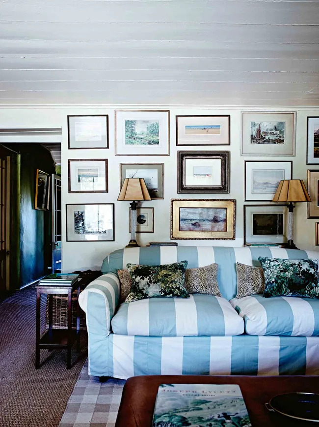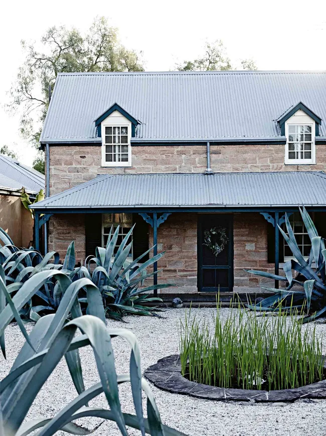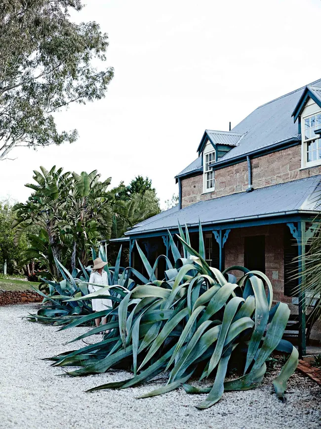 The garden has informed much of their experience of the house. “It fills the view from every window,” Mickey says. Two giant American aloes (Agave americana) flank the entrance to the sandstone cottage, and influenced the choice of upholstery fabric on the blue-grey striped sofa in the sitting room.