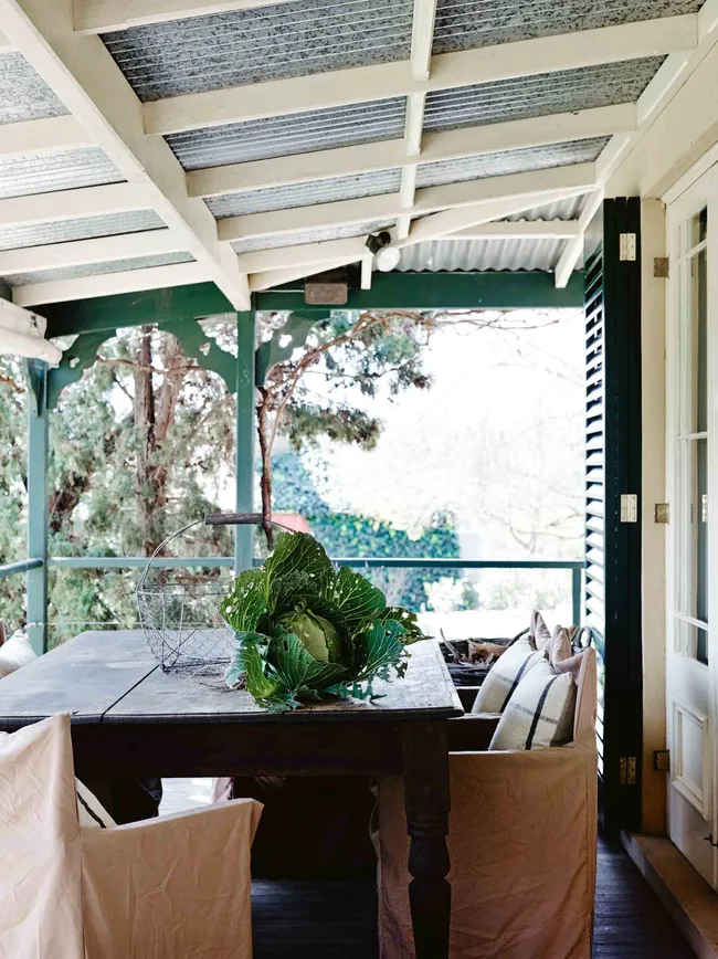 On the verandah, a just-picked cabbage sits on a table rescued from the Wollondilly Shire Council office, and surrounded by second-hand director’s chairs covered in tan canvas.