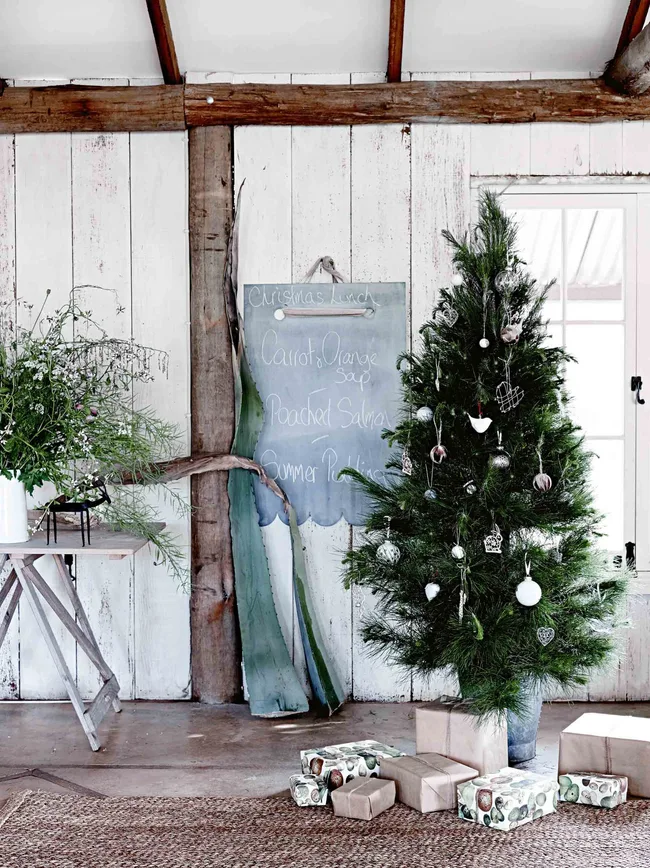 This year, the old dairy has been chosen as the setting for the Christmas tree: “Simple, bright, a bit rustic and fresh, with seedhead flower arrangements, and brown paper packages tied up with string, interspersed with quail- and duck-egg paper,” explains Mickey.