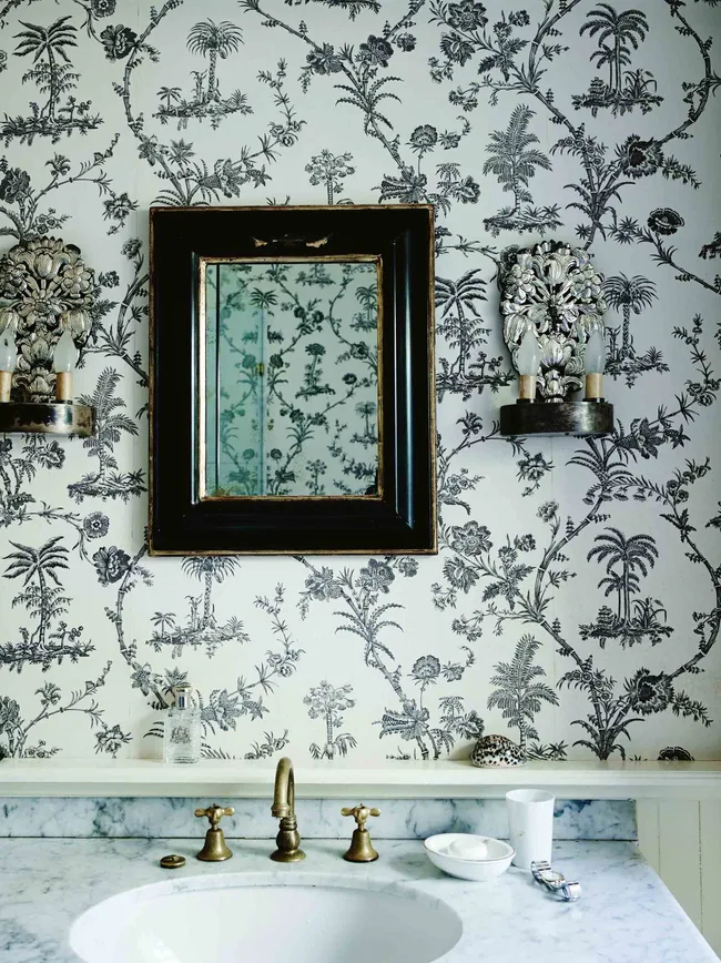 A mirror from England offsets the ‘West Indies Toile’ wallpaper from Brunschwig & Fils. The Robertsons spent their first night at Glenmore House in November 1989, but adding additional wings, and turning it into a four-bedroom house with extra bathrooms, took time. It wasn’t until 1995 that they moved in permanently.
