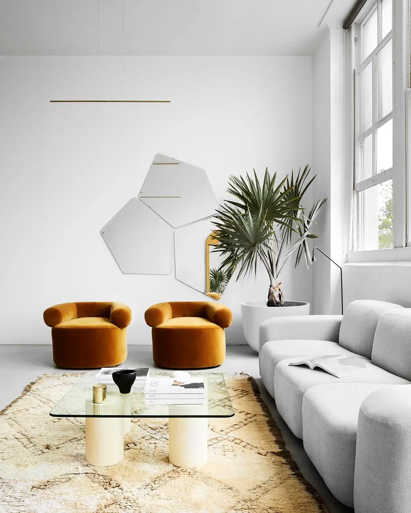Unique mirrors also make great friends with art. For example, a mirror above a mantel could be flanked by two artworks of the same size or the other way around where a grouping of four artworks in matching frames would look great flanked by a pair of matching mirrors. Round mirrors and arched mirrors will also make a statement, and pair perfectly with curvy furniture.