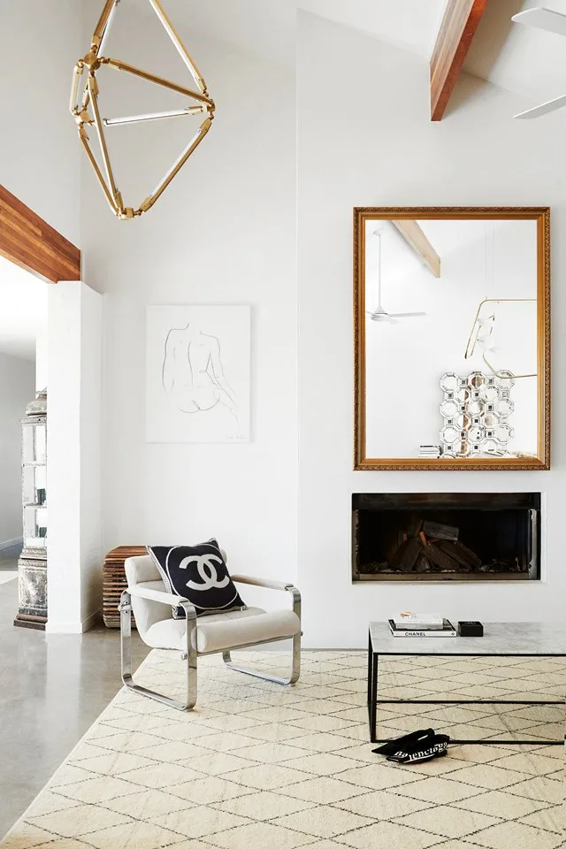 Amanda Shadforth’s mid-century-meets-Palms Springs-style home features a carefully considered mix of designer and vintage finds, like this gilt framed mirror. Photographer: Julie Adams | Styling: Kristin Rawson
