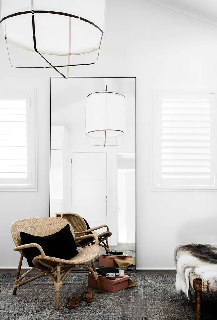 Contemporary touches, such as a large leaner mirrors and a statement linen pendant lend a sophisticated element to the relaxed aesthetic of this bedroom in a stylist’s minimalist home in Sydney’s Seaforth. Photographer: Maree Homer | Stylist: Kristin Rawson