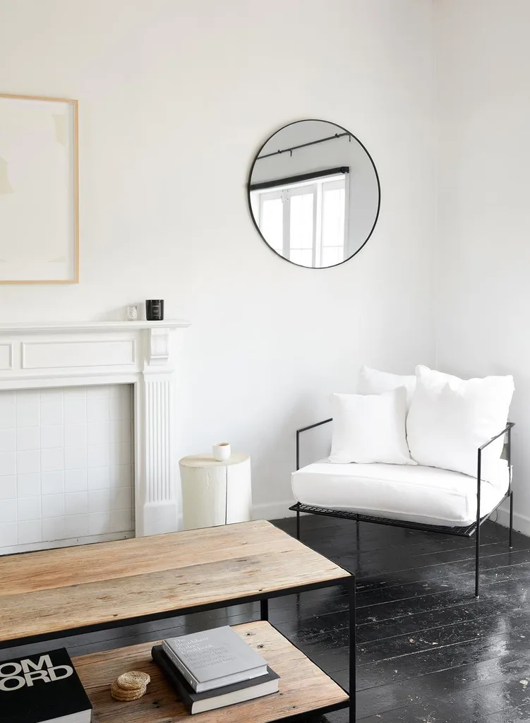 The home of stationery visionary and monochromatic influencer, Beck Wadworth featured a monochrome round mirror. Photographer: Kirsty Dawn