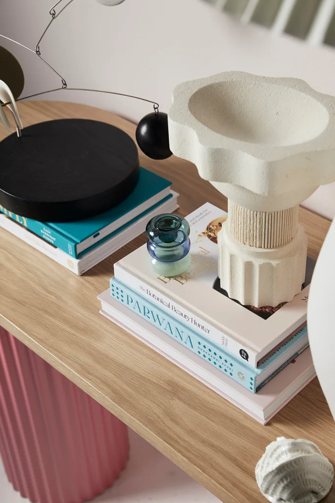“The visual symmetry of this scene is exactly what makes it so pleasing,” says stylist Lisa Burden. “The three artworks sit over the console, the centre artwork is pink, similar to the legs, creating a triangle of colour, and the pleats of the lamp are mirrored in the base of the bowl and legs.” The subtle wall colour and neutral palette of the accessories allow the console to pop rather than fight for your attention. “The mobile gives a sense of movement in this vignette so it doesn’t feel rigid, while the handmade items supply natural texture,” Lisa adds.