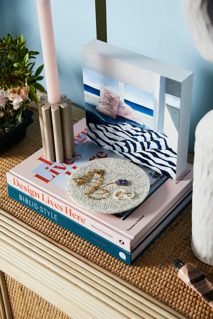 Andrej Urem ‘Crux’ candle, $70, Makers Mrkt. Mima vase in Natural, $79.95, Kas. Aeyre ‘Prima’ candlestick, $129, Reliquia Collective. Books from Kinokuniya. Candle and candle holder, stylist’s own. The Invitation artwork by Liss Finney, $500, Saint Cloche. Vanity organic display plate, $155, Marloe Marloe. Floria necklace, $149, Reliquia Collective. Alex hoops, $129, Reliquia Collective. Asymmetry vessel by Kerryn Levy, $1200, Curatorial+Co. Resurrection Aromatique hand balm, $33 for 75ml, Aesop.