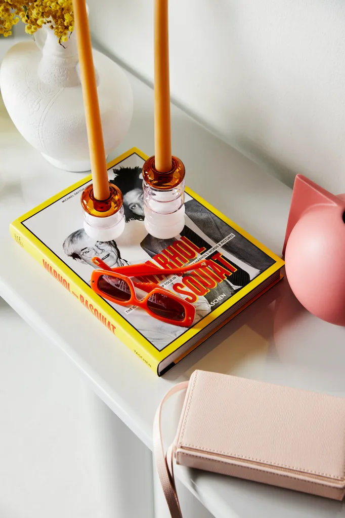 Gavin glass bowl, $149, McMullin & Co. No.010 Cup for Fingers vessel in Tangerine, $65, Softedge Studio. Mama vessel by Katarina Wells, $800, Curatorial+Co. Cisco & The Sun ‘Anika’ vessel, $109, Clo Studios. Elsa Peretti ‘Thumbprint’ dish, $220, Tiffany & Co. Elsa Peretti pen, $155, Tiffany & Co. Tribal vessel in White, $65, Luci The Label. Book from Kinokuniya. Pauline candle holder in Amber, Pink and White, $49 for petite, and Pauline candle holder in Amber, Pink and White, $79 for grande, Maison Balzac. Everyday taper candles in Natural, $30 for set of 2, Love After Love. Donna sunglasses in Fire, $385, Lucy Folk. Dahlia textured box bag, $249 for mini, Oroton. Howard vase in Desert Rose, $59.95 for small, Kas.