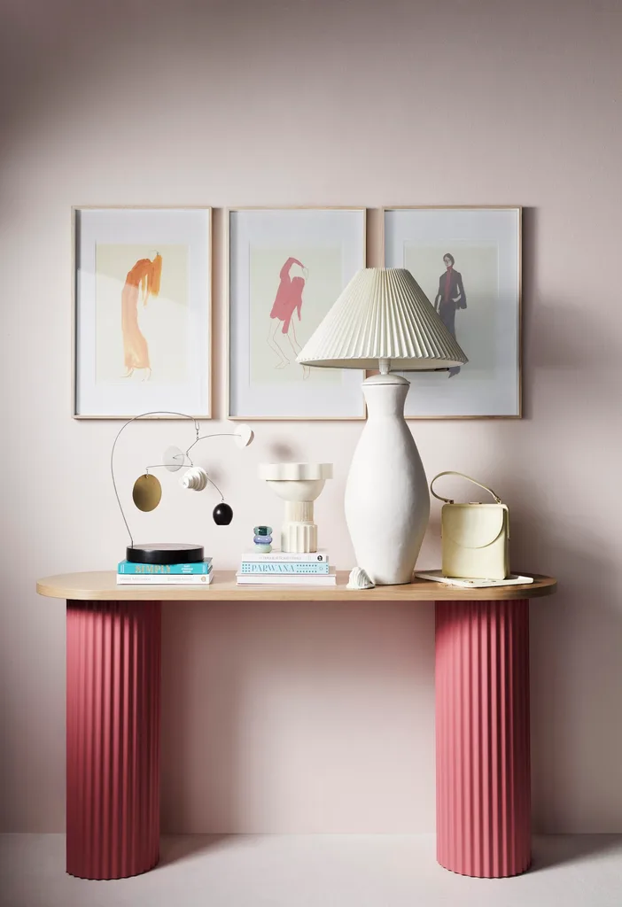 Ridge console in Oak, $2565, Beeline Design. Adler A2 poster frames in Natural, $99.95 each, Country Road. The Saffron Dress, The Pink Pose and The Suit artworks by Amelie Hegardt (30cm x 40cm), $47.50 each, Paper Collective. Eggshell acrylic paint in Petal Pink, $130 for 4L, Porter’s Paints.