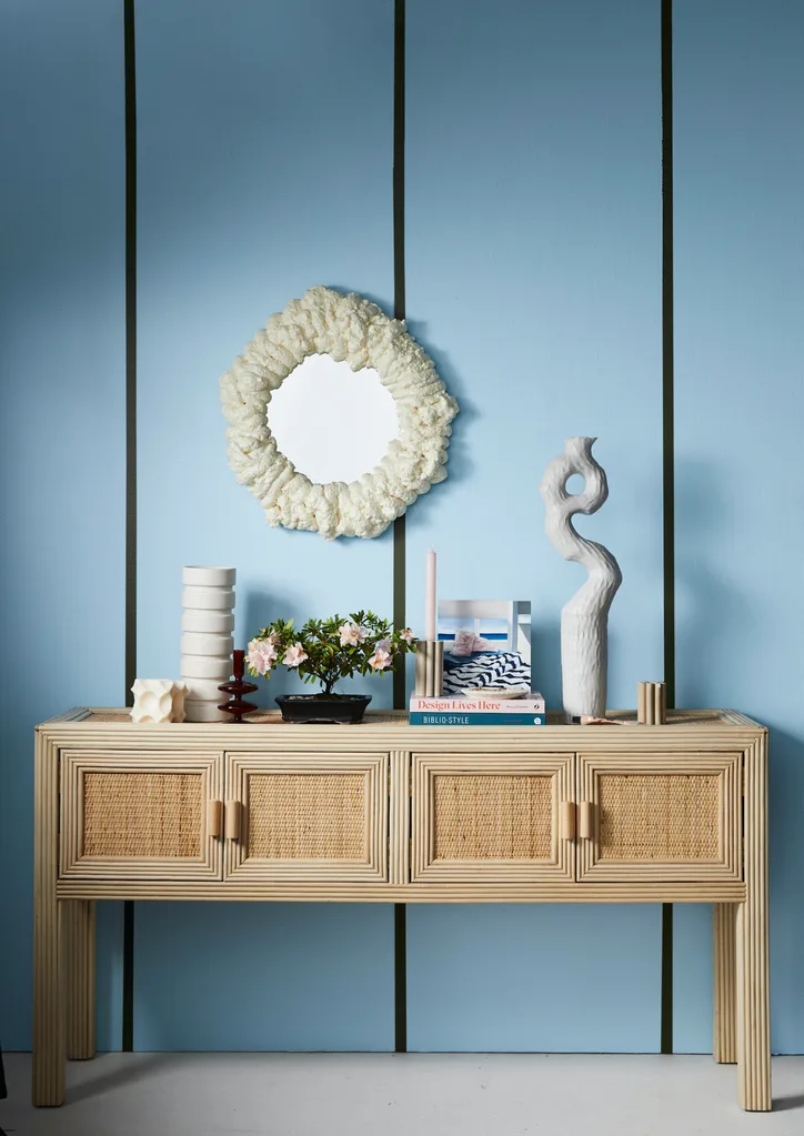 Airlie console in Natural Rattan, $1199, OZ Design. Annabel mirror, $119, McMullin & Co. Wash&Wear paint in Breezy Quarter, $79.90 for 4L, and Amazon Depths, $94.40 for 4L, Dulux.