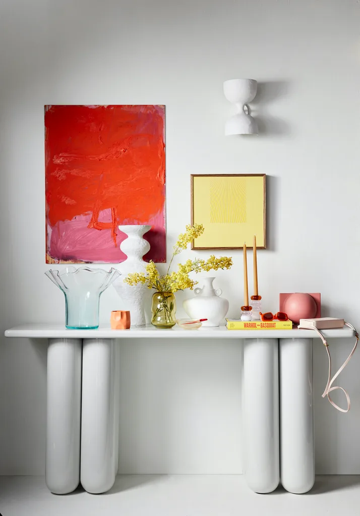 Bold console, $2625, Domo. The Poet And The Mystic artwork by Monique Lovering (81cm x 61cm), $3100, Curatorial+Co. Easy artwork by Kasper Raglus (36cm x 36cm), $750, Modern Times. Double cup wall light, $700, Anna Charlesworth. Wash&Wear paint in Vivid White, $79.90 for 4L, Dulux.