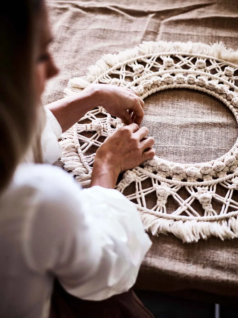 Macrame artist weaving woven wall hangings