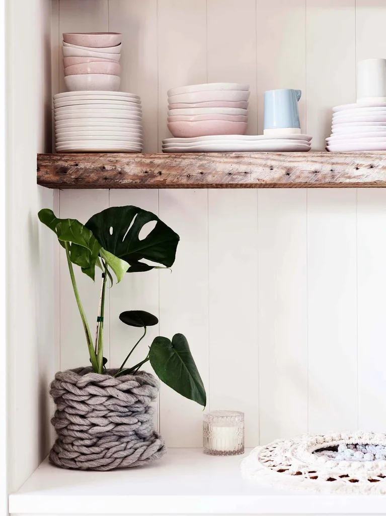 The wool pot plant holder was made by Brydie.