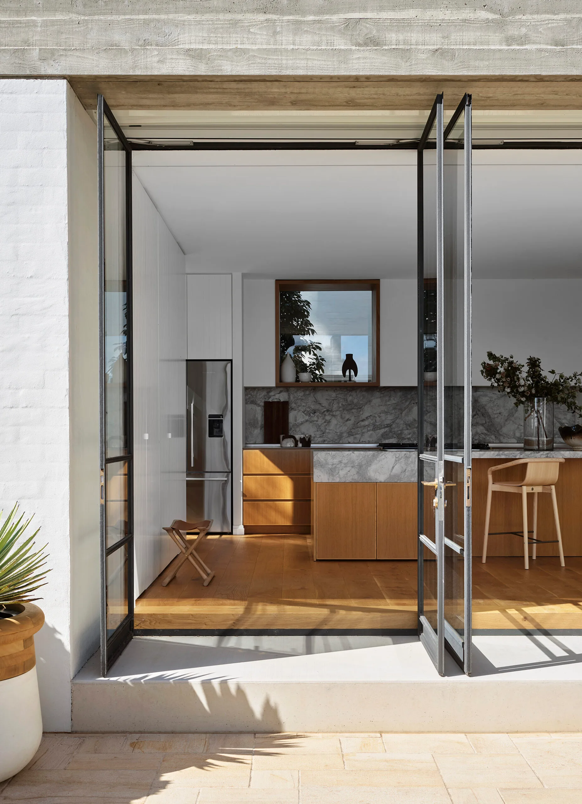 French-style steel and glass doors swing open to allow the breeze into this Mediterranean-style home in Castlecrag, while creating a seamless indoor outdoor flow.