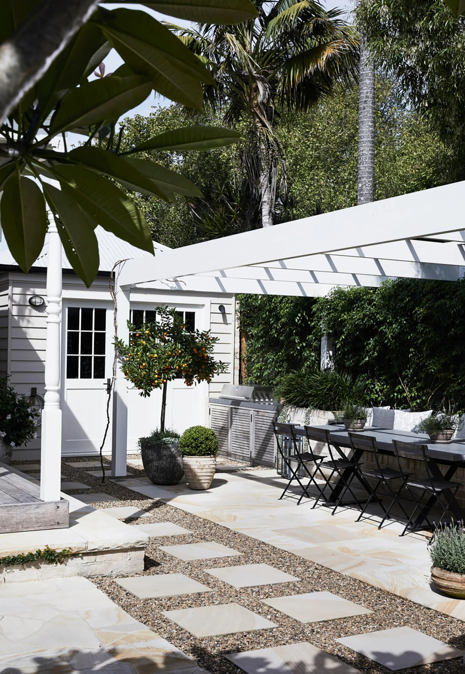 The vernacular of this charming home in Berry is quintessential Australian weatherboard cottage, complete with pergola and pebbled courtyard.