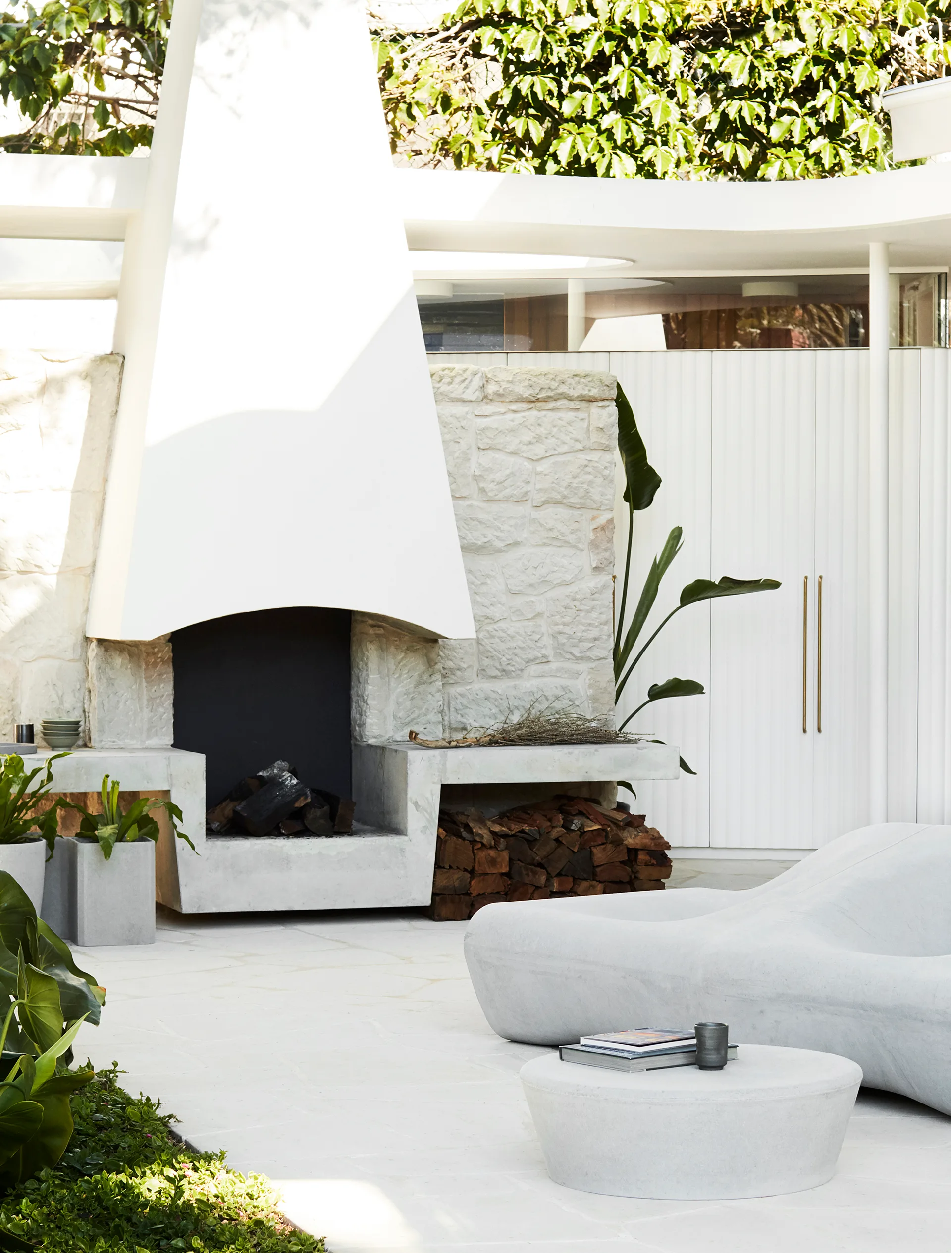 An outdoor fireplaces gives guests a reason to linger longer outside at this mid-century home with a sensitive renovation.