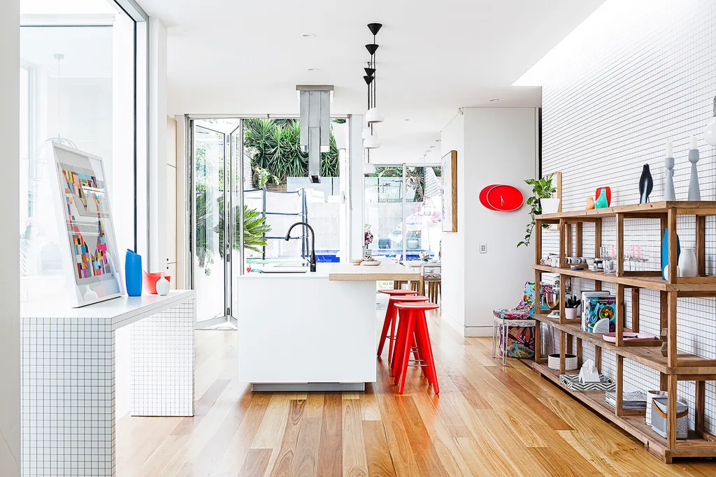 In this colourful family townhouse, a strategically placed skylight provides natural illumination for the art and homewares on display in the kitchen. A hit of red in the stools and clock lifts the space. Photo: Maree Homer
