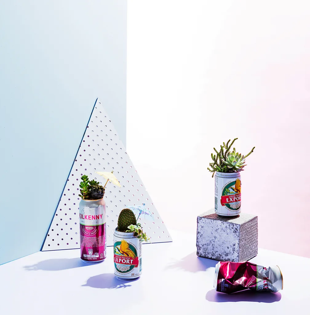 You will need: 6 x empty & clean beer cans; utility knife; succulent potting soil; assorted cacti & succulents (we used 2 per can); pebbles; cocktail umbrellas (available from most supermarkets)