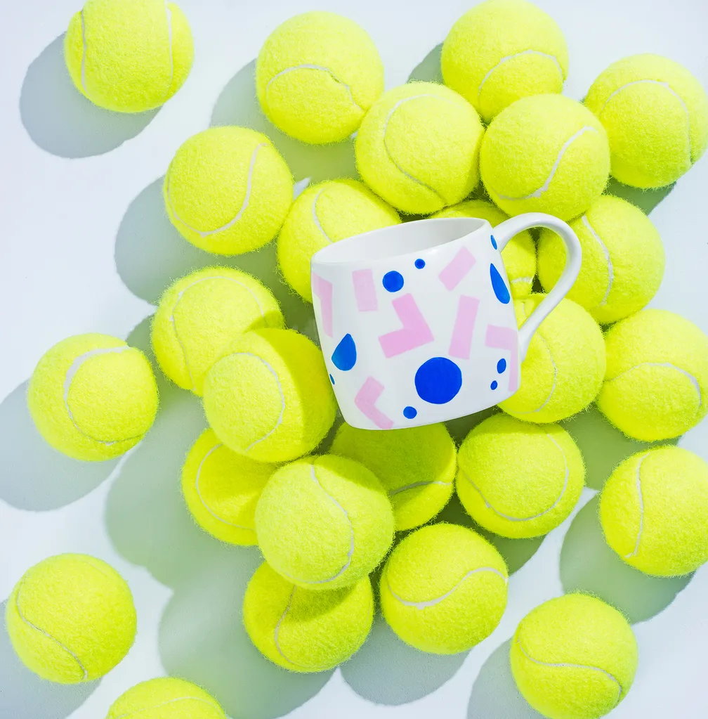 Dwell mug, $10 for set of 4, Target. Tennis balls, $10 for pack of 15, Kmart. Paint Dulux Wash & Wear in Atelier (background), $45.90 for 1L.