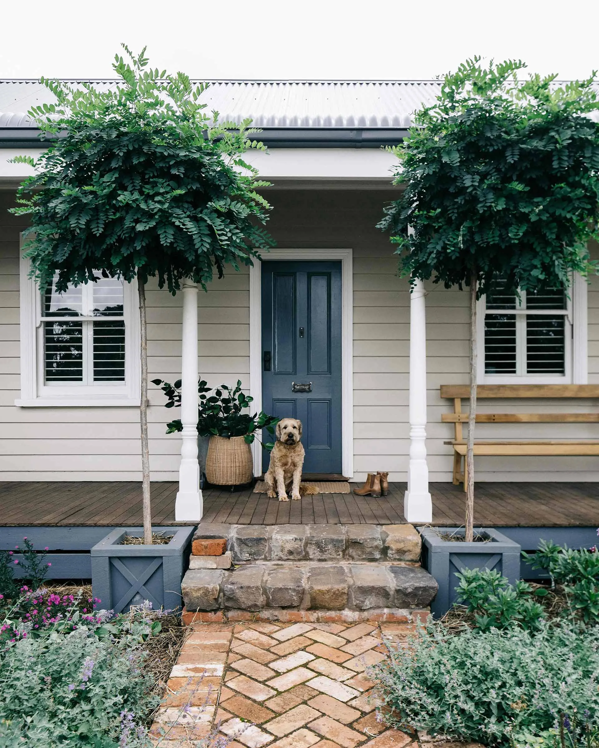 Keegan the Irish wheaten terrier greets visitors at Acre of Roses. The front door is painted Dulux Blue Ridge. Photography: Marnie Hawson