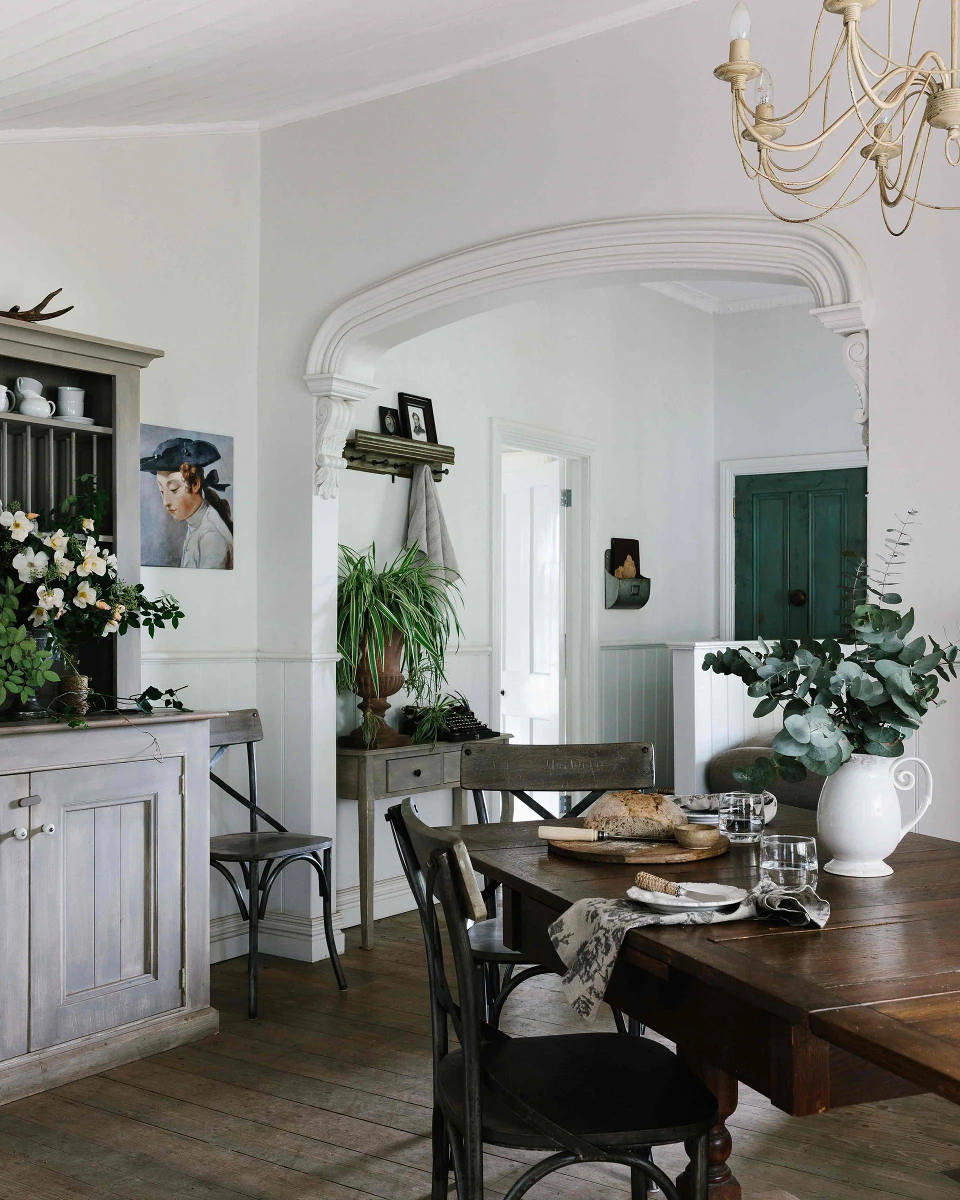 The oak table is a family heirloom and chairs were sourced by interior stylist Belle Hemming. The Jean Baptiste print is by French painter Pascal Amblard. Photography: Marnie Hawson