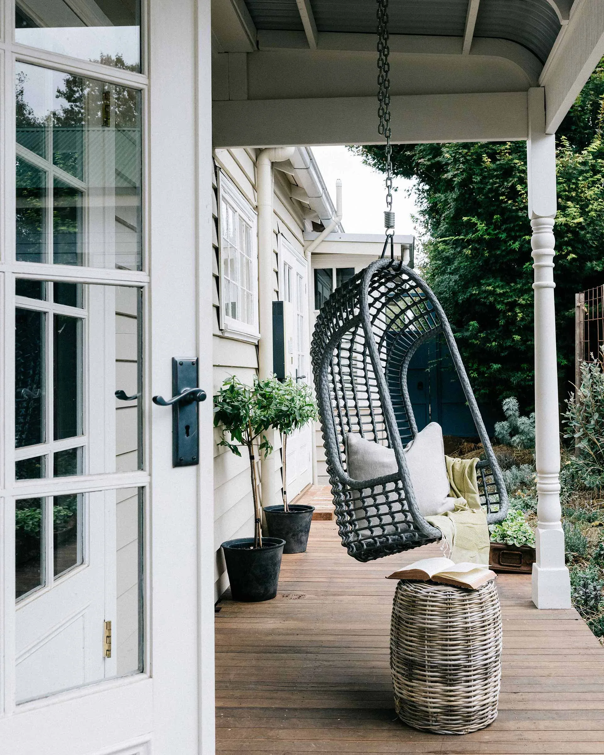 A hanging chair from HK Living and wicker stool from Early Settler on the verandah. Photography: Marnie Hawson