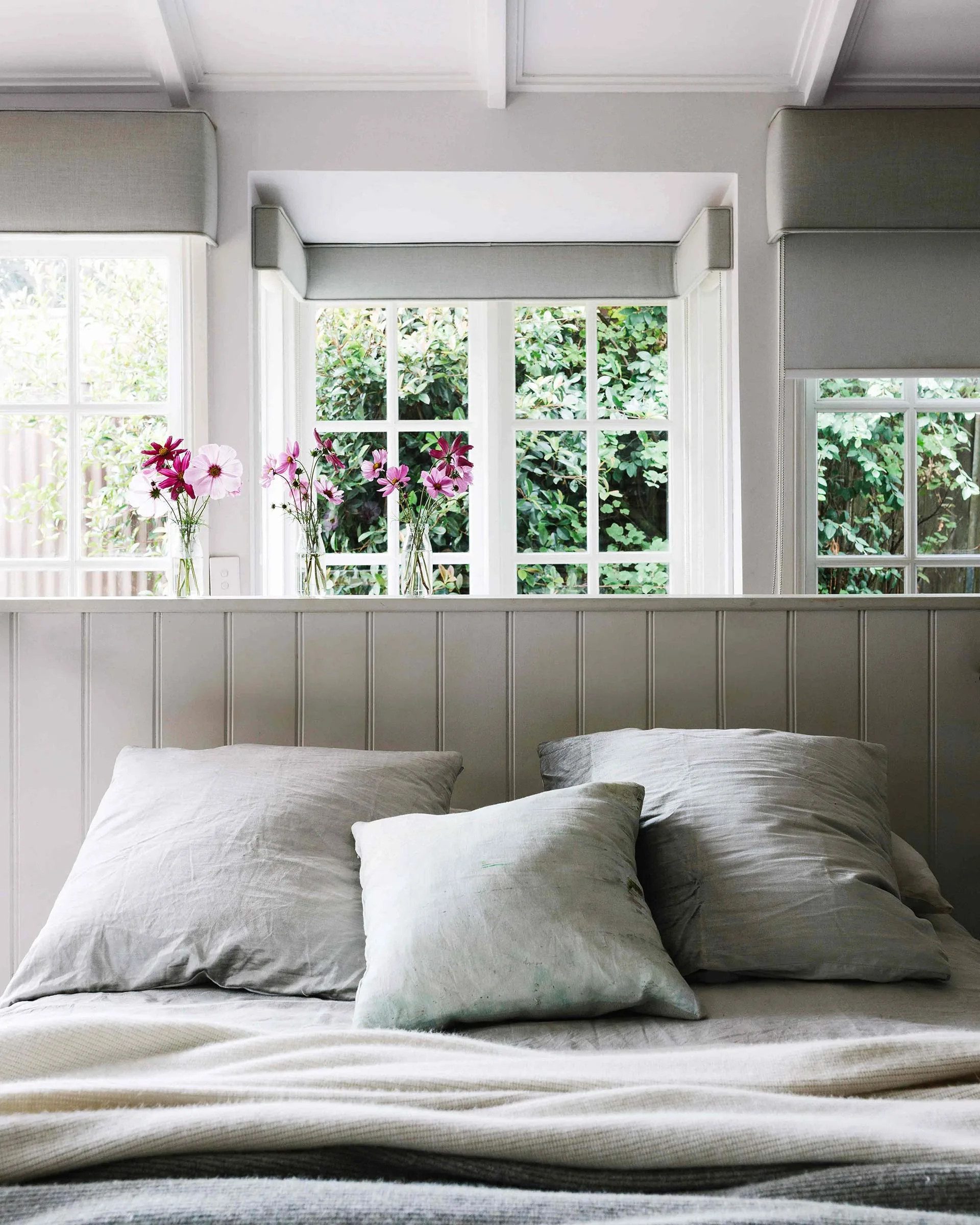 Rob rebuilt the master bedroom, installing new windows, raising the roof and making the wooden bedhead. Bed linen is Cultiver with blankets by Bemboka. Photography: Marnie Hawson