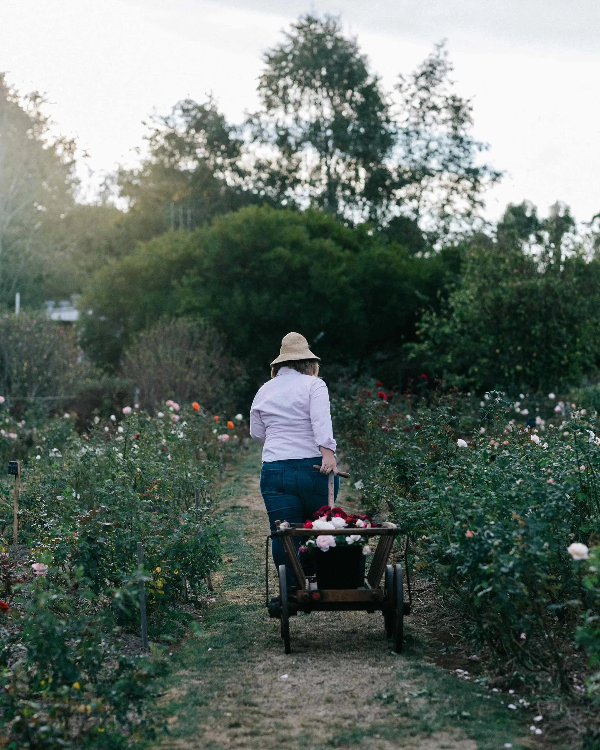 Sandy uses an old picking trolley she found in a prop shop when cutting roses. Photography: Marnie Hawson