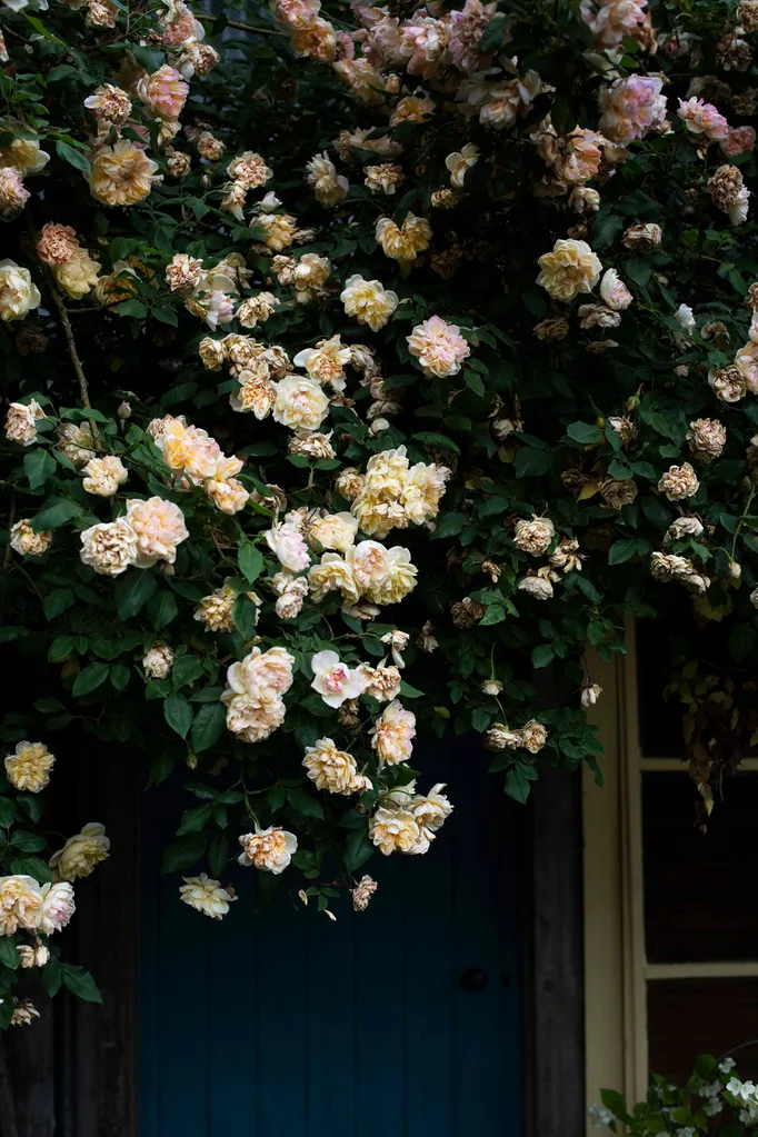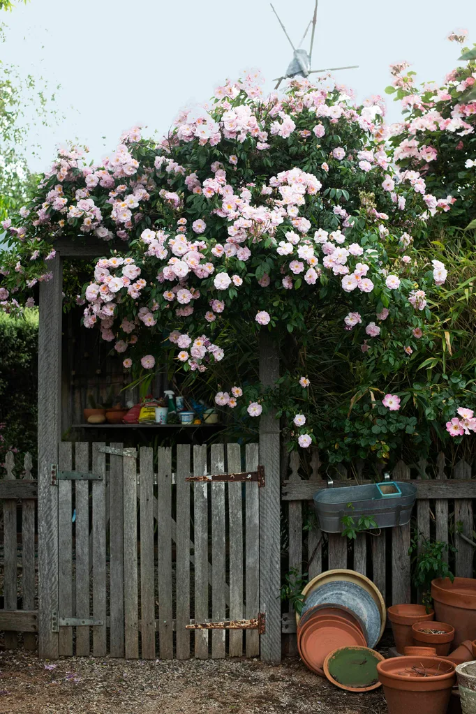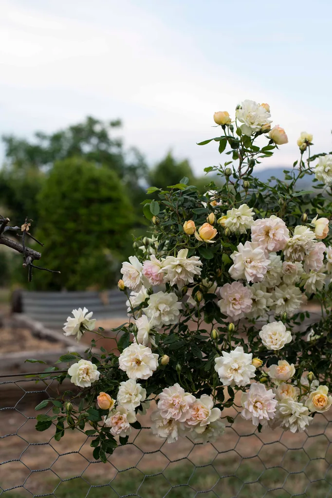 The climbing floribunda rose ‘Renae’ tumbles over the gate that leads to the chicken house.