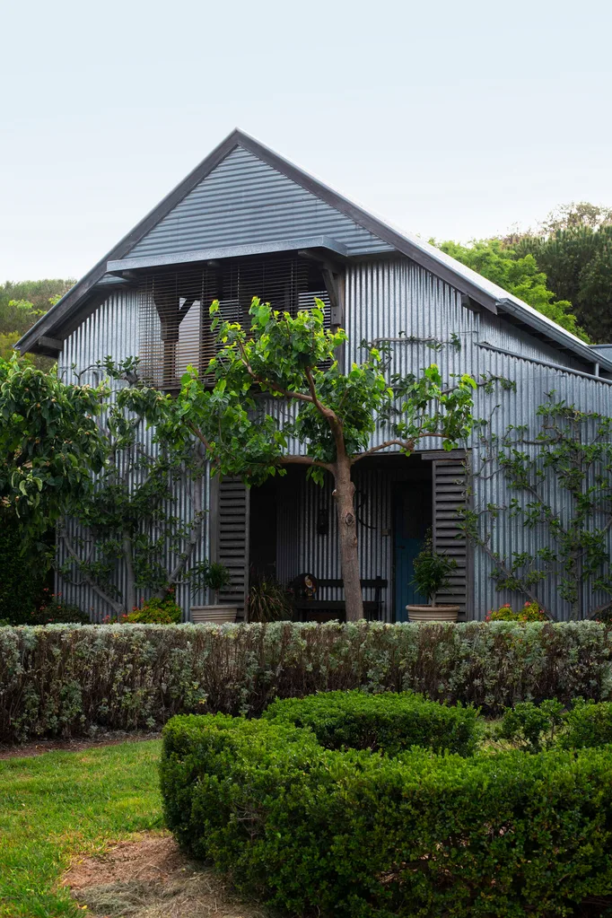 The grey foliage of the clipped wormwood hedge complements the corrugated iron on the garage.