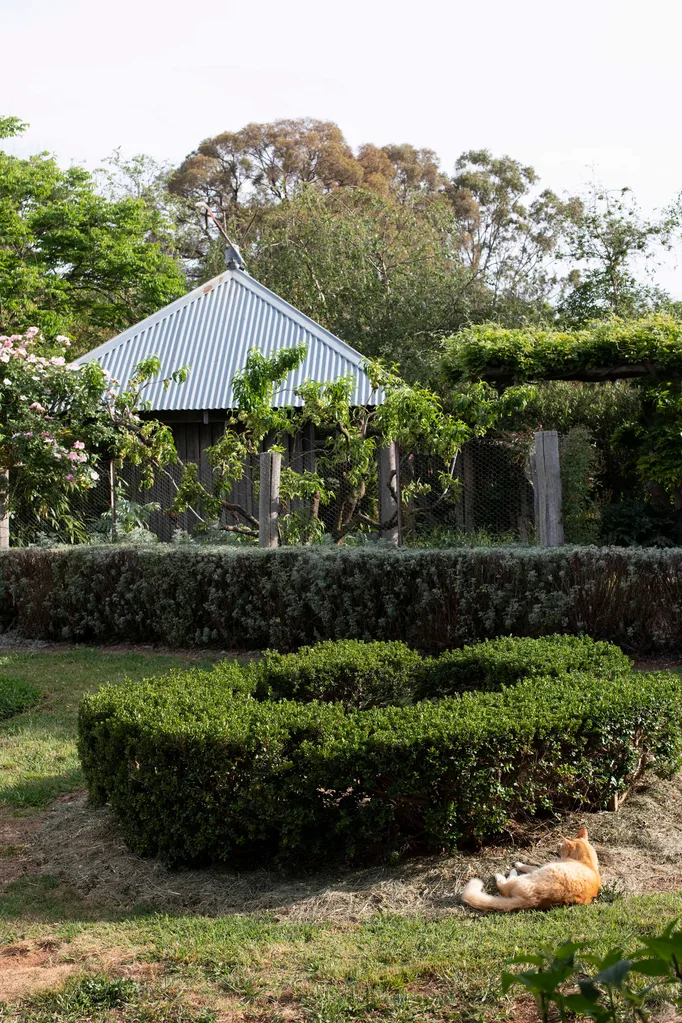 Her ginger cat Maude relaxes in the sun beside a Luma apiculata hedge. The chicken house can be seen behind it.