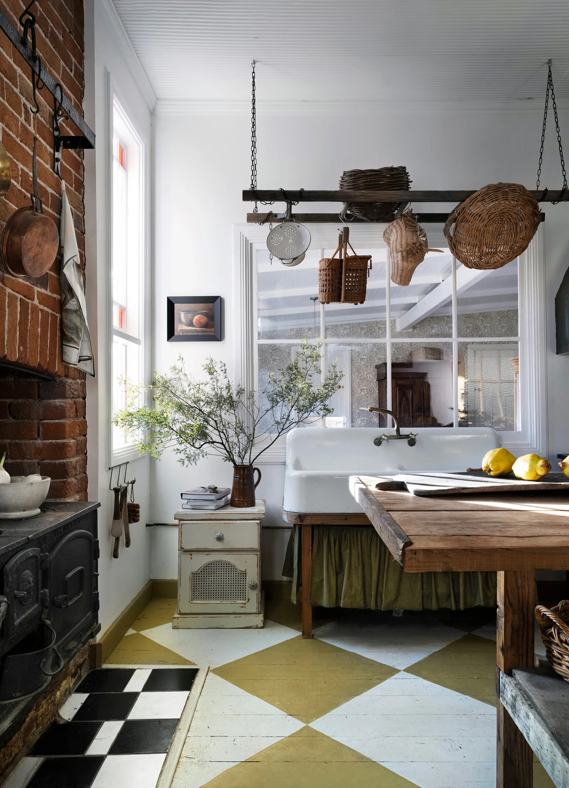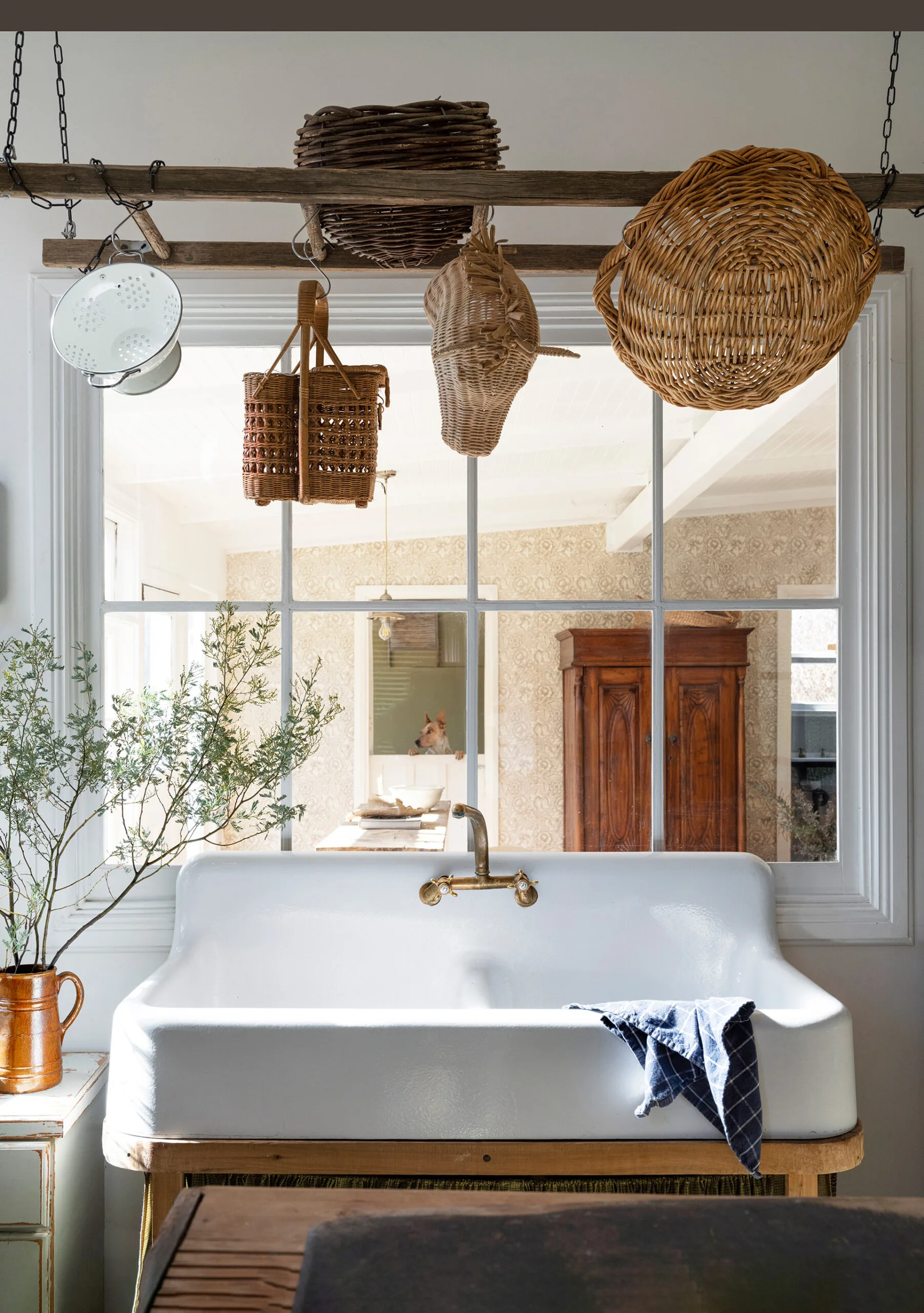The kitchen was updated with a Smeg fridge and Falcon Nexus integrated oven (“It cooks so beautifully”), and a suspended ladder holding a variety of cane baskets.