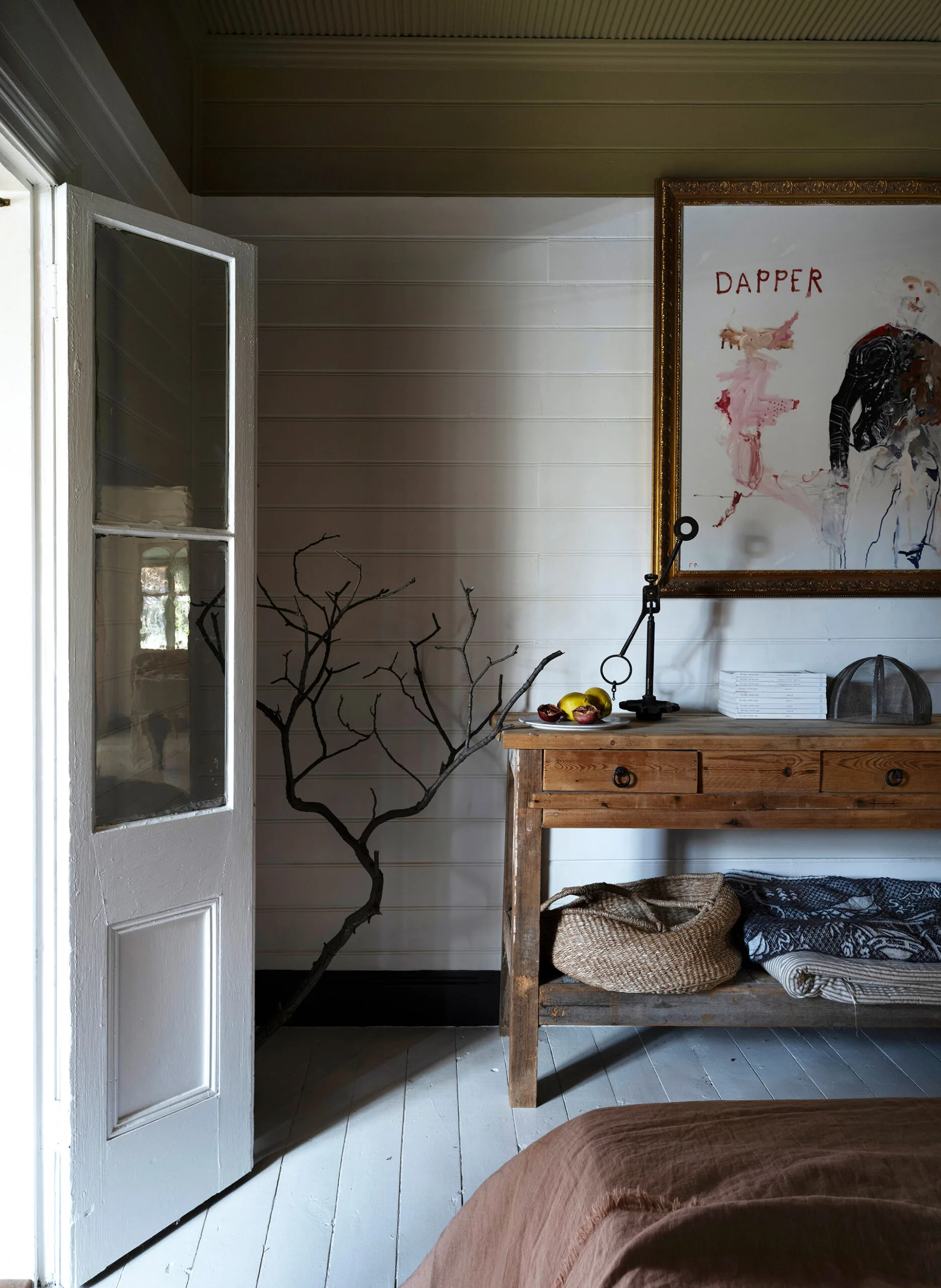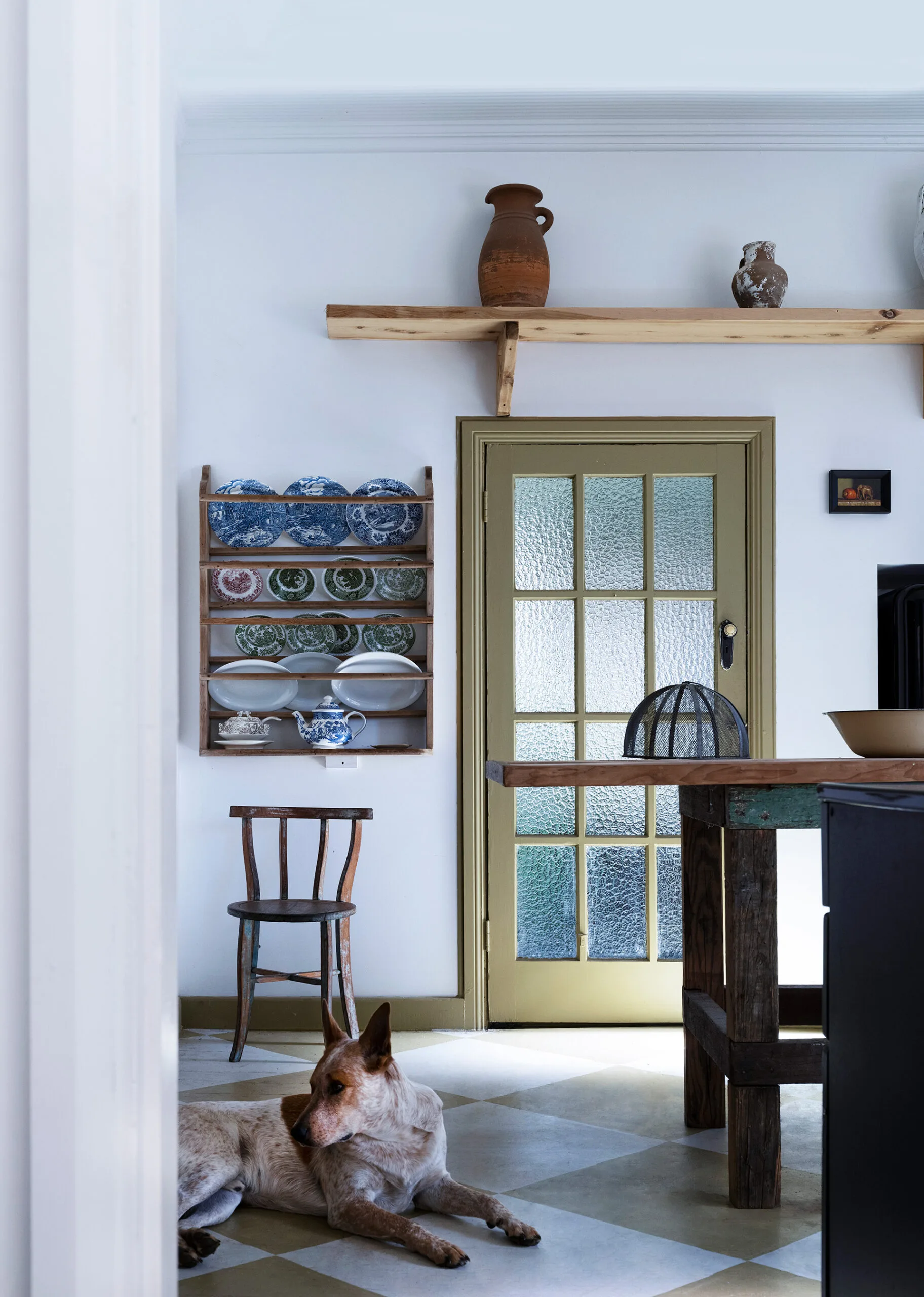 Red cattle dog-dingo cross Alf sits in the kitchen, where a timber shelf, custom-made with milled wood from Canopus Farms, spans the depth of the room and holds pots from Watertiger. Pretty plates by Casa Adams decorate the wall. The large, farmhouse-style island came from a seller in Sydney. Kasturi enjoys scouring Verandah Collective in Mudgee for interesting artworks and decor.