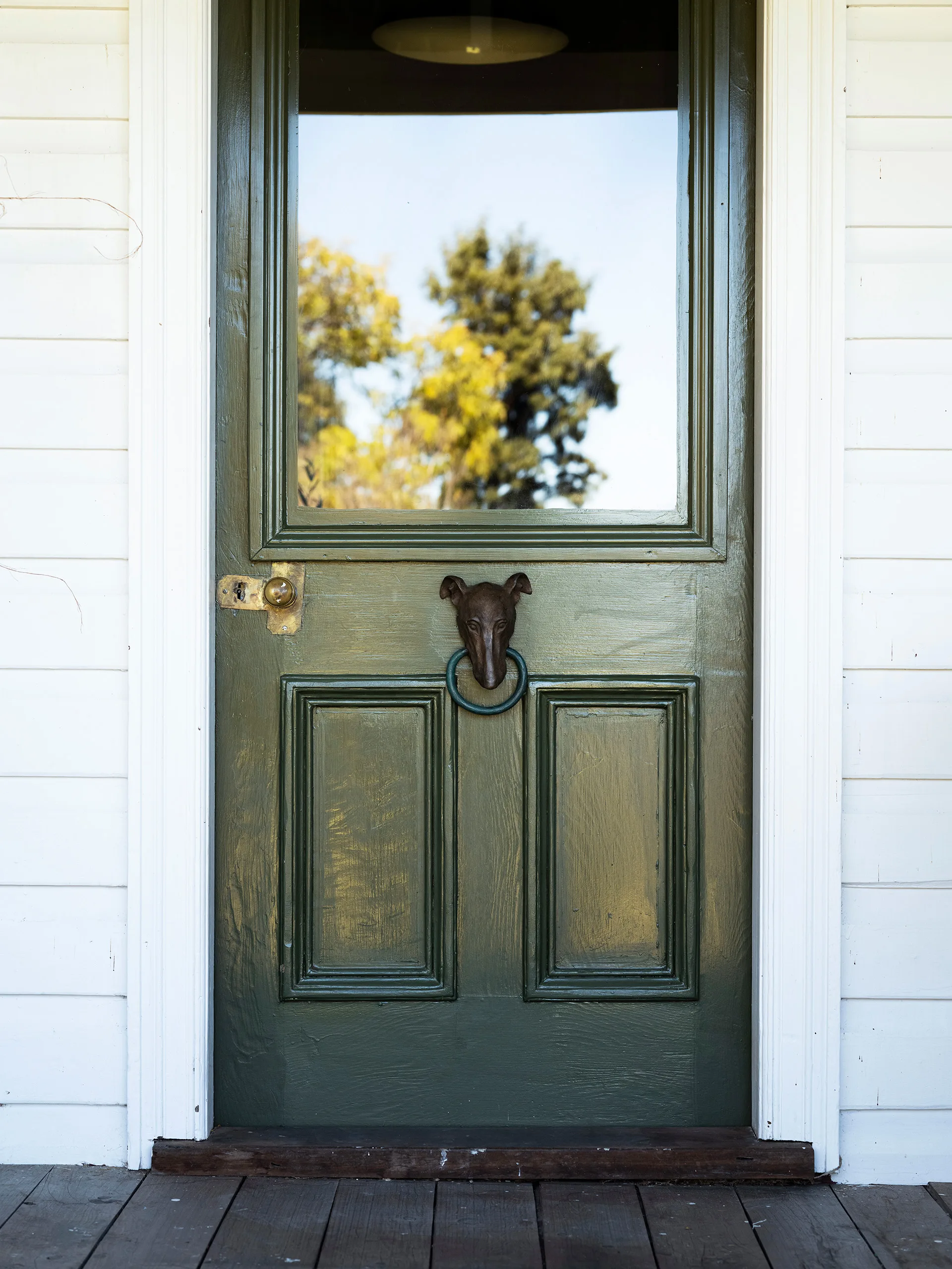 The front door, painted in Murobond Row Boat, has a charming greyhound doorknocker from Etsy.