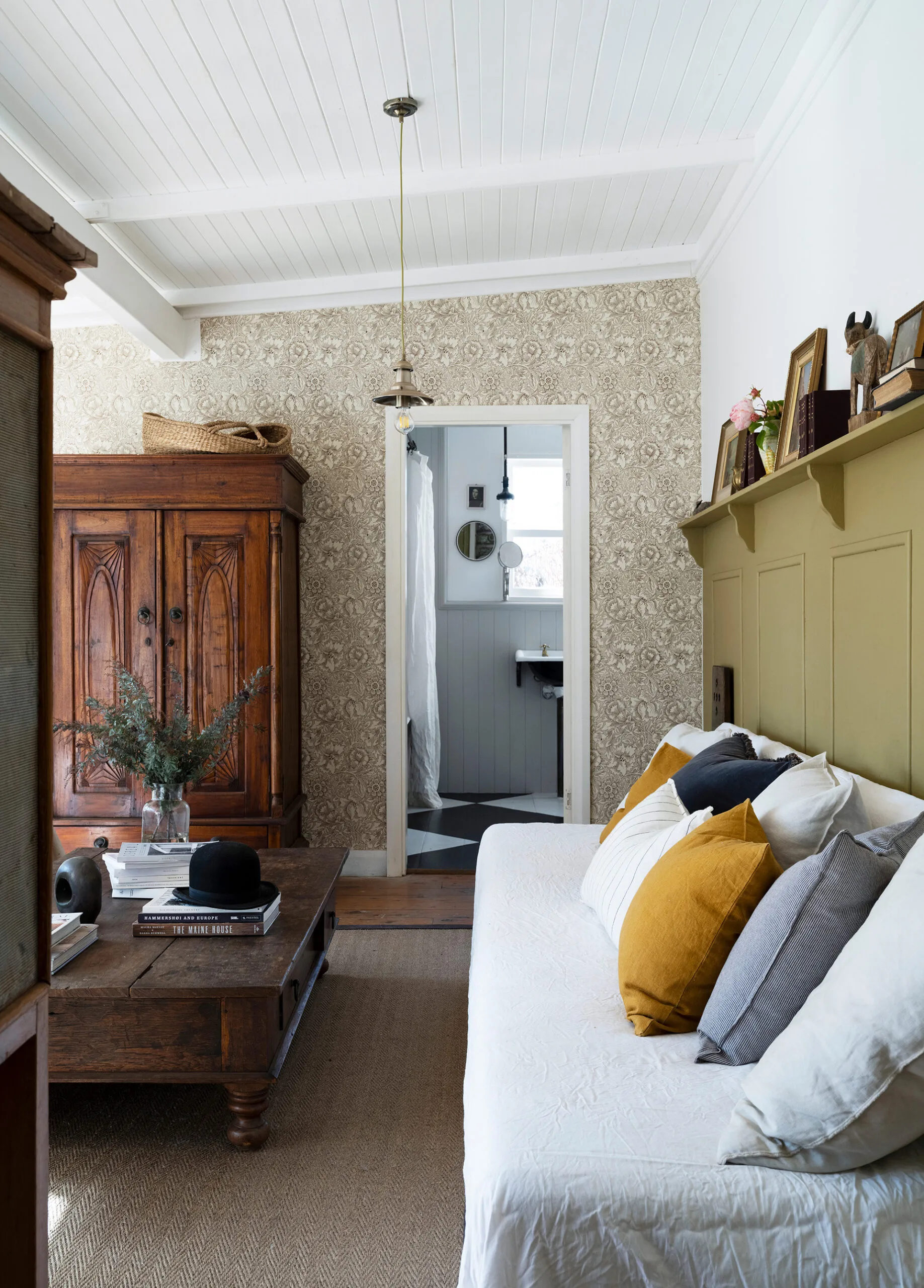 In the living room, the decorative wallpaper by Morris & Co is Kasturi’s nod to the Arts and Craft era in Britain. The ornate cupboard was purchased for $100 from a friend of a friend in Darlinghurst, while the white sofa is from MCM House. Beneath the antique Indian coffee table, from Raffan Kelaher & Thomas, is a custom-designed rug by Floorspace.