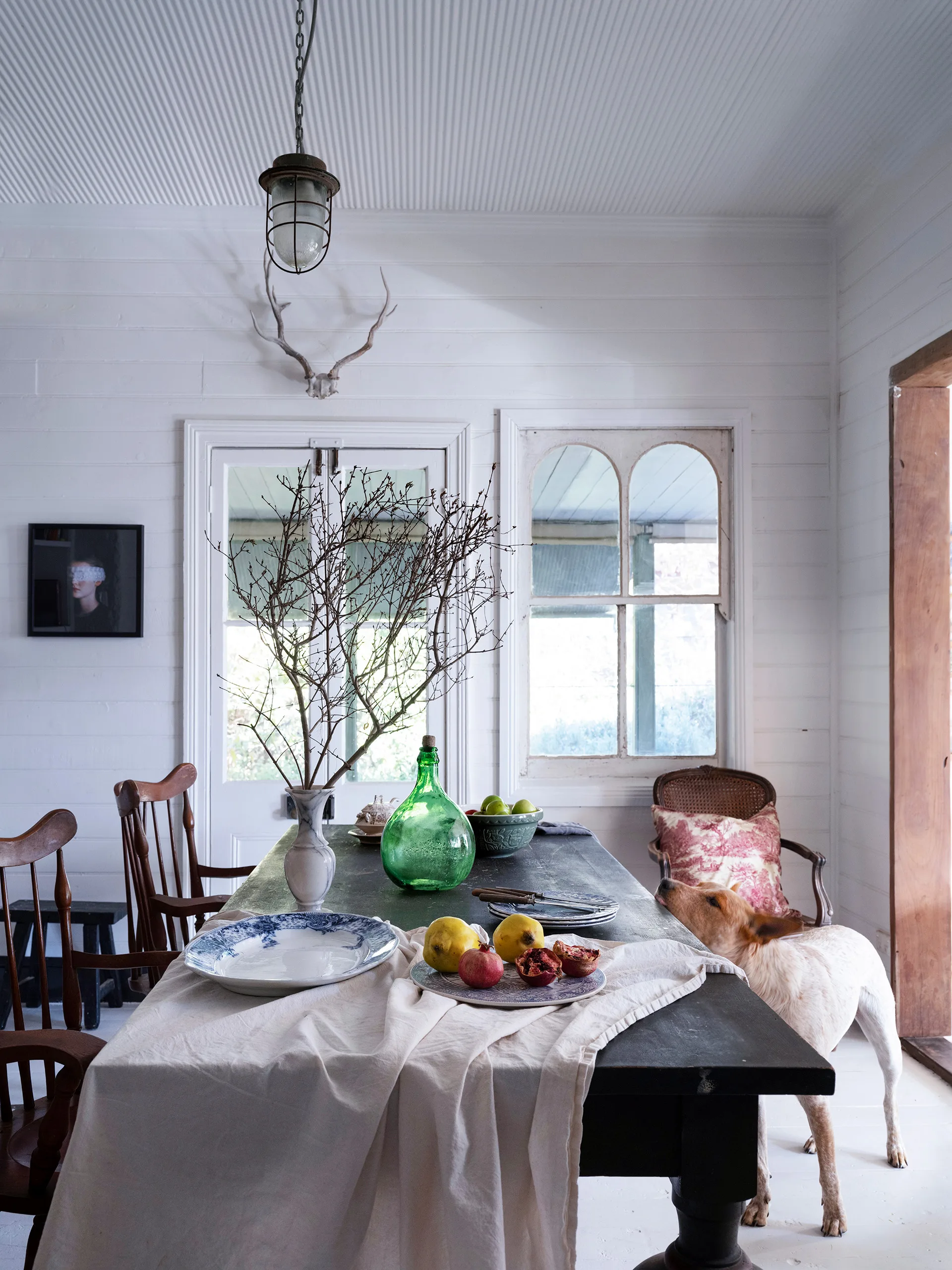 “I fought hard for the curved-leg Danish table at the Raffan Kelaher & Thomas auctions,” says Kasturi of their dining table, where Alf waits for a snack. The wall art is part of a Portraits series Kasturi commissioned with photographer Kayla Guthrie of “solitary figures in living spaces”.