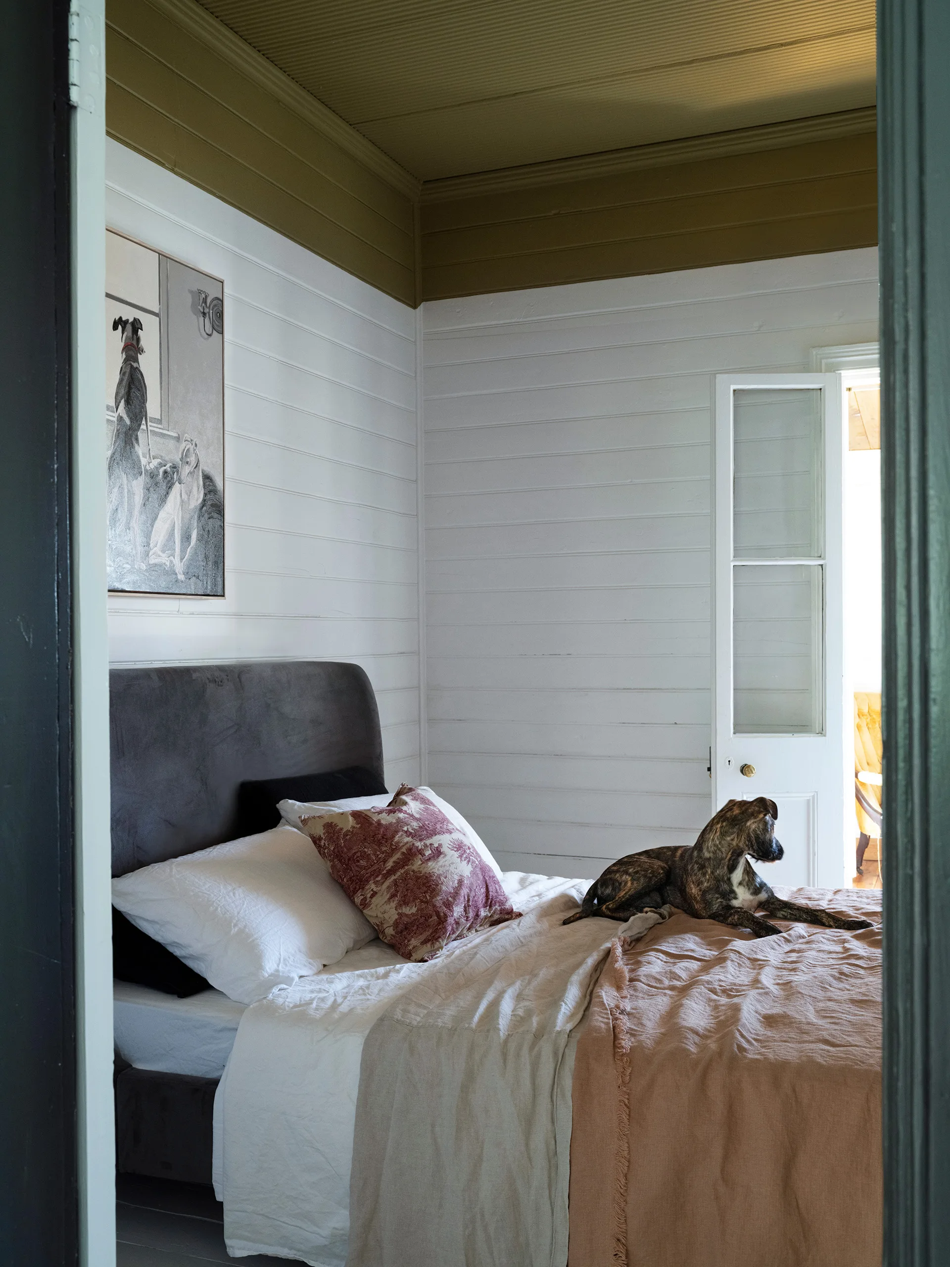 Willow sits on the bed below artist Kim Harding’s depiction of Kasturi’s much-loved whippets Toby and Coco, who live with her ex.