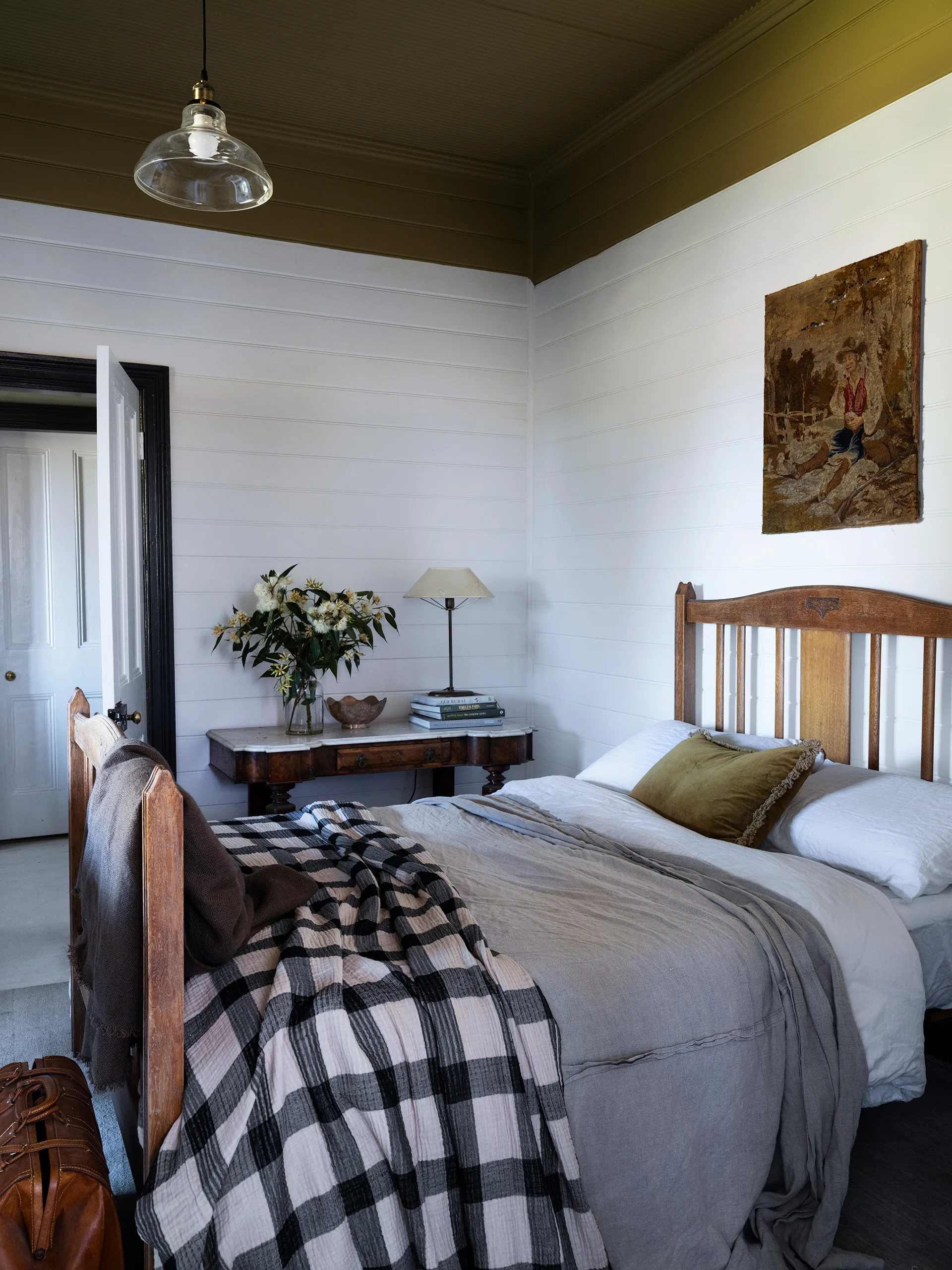For the Willow’s Tale bedroom, Kasturi opted for vintage artwork and chequered linen from Verandah Collective, along with a beige linen coverlet from Simpson Cottage.