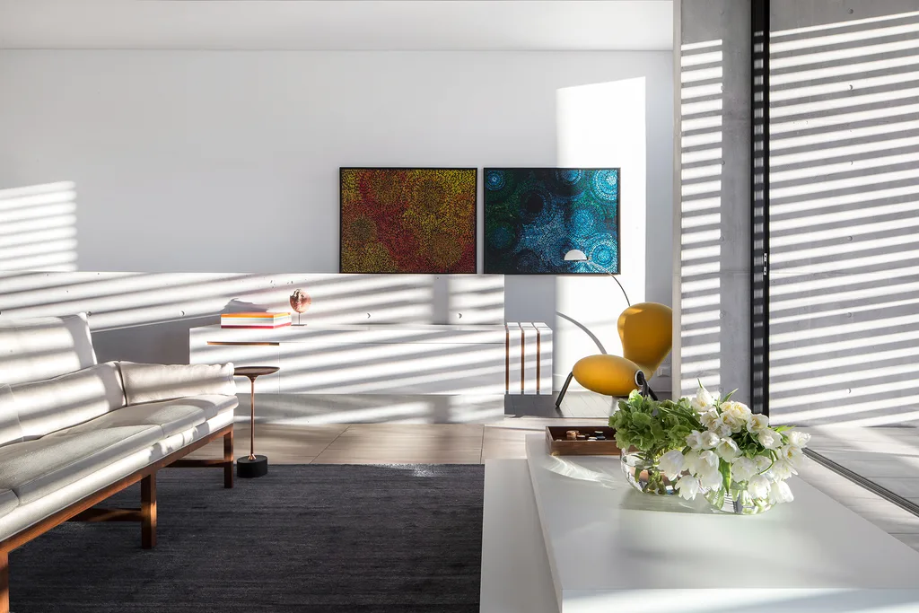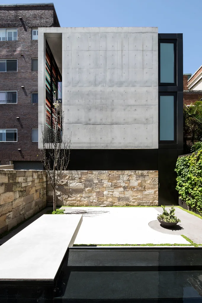Above the sandstone base that nods to the building’s past (all the blocks were excavated from the site), a serious concrete and glass structure rises up, marked out playfully with colourful louvres. This graphic interpretation adds interest to the facade and responds to the area’s heritage past. “It took a long time to do it … a ridiculously long time,” remembers William, of creating the custom facade artwork, inspired by local heritage colours as well as by more Modernist Le Corbusier schemes. “We started playing around, came up with 10 options, cut it back to three, and then lived with it for a few weeks. As Ellen and Walter were owner-builders, we had the time to do it.”