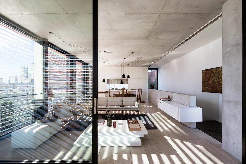 The top floor is open plan with no columns to break up the space. The coffee table was designed by Smart Design Studio with a hinged lid to conceal the television and IT equipment. Custom removable wooden trays provide storage.
