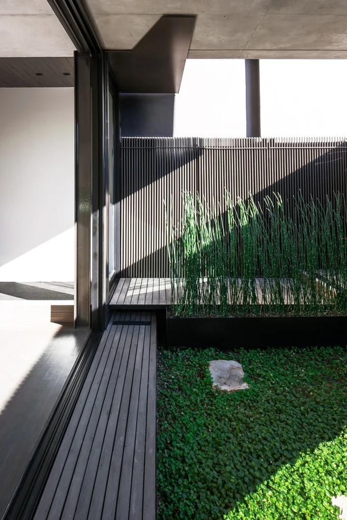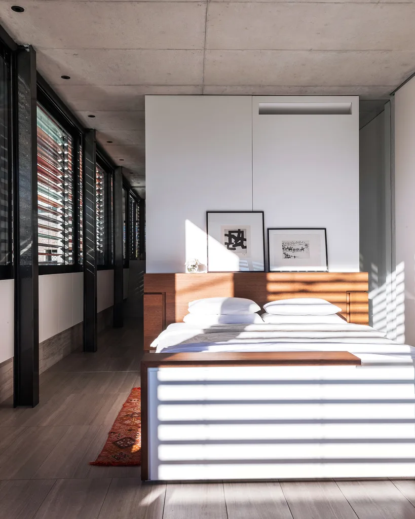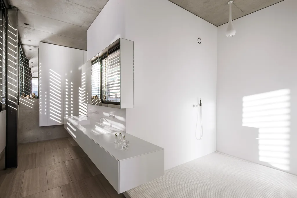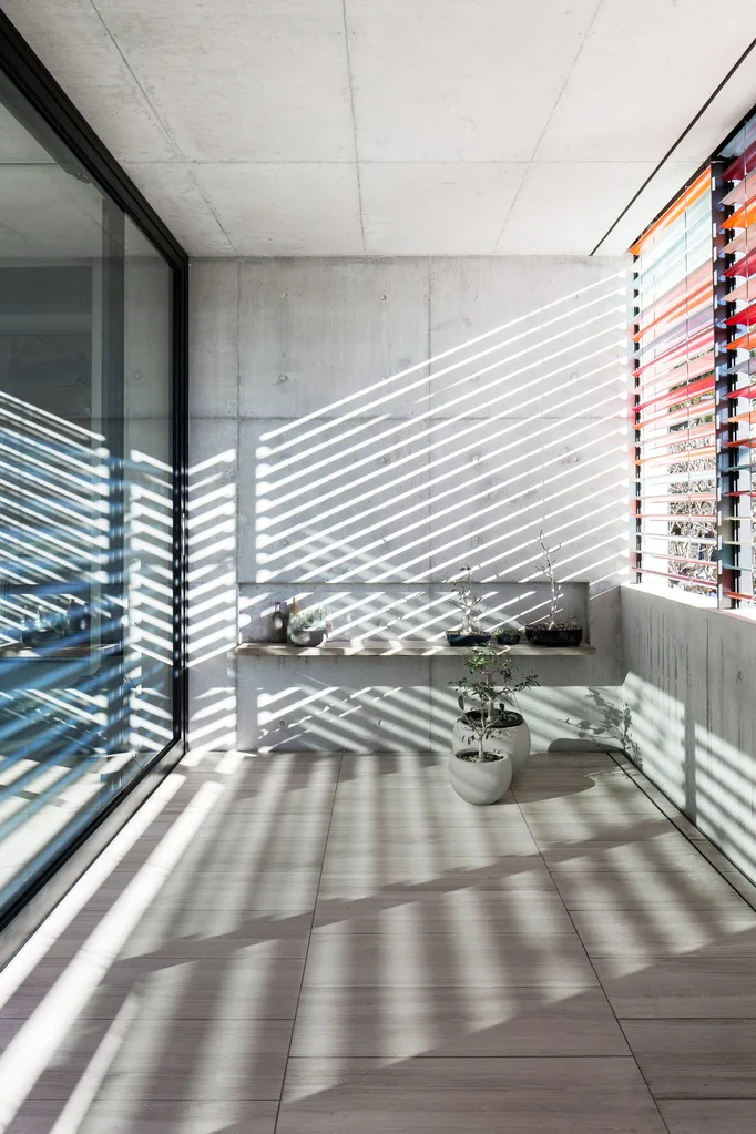 Powdercoated aluminium louvres contrast with off-form concrete walls and travertine tiles.