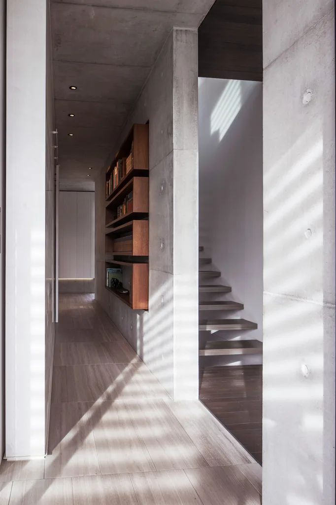 Timber floating stairs and off-form concrete blade walls.