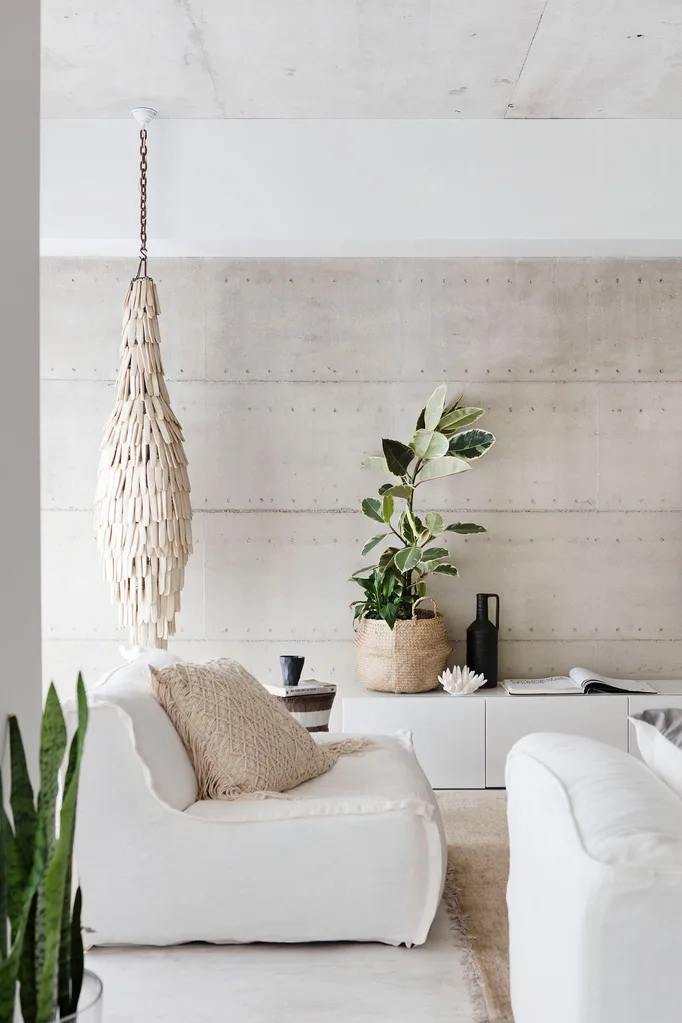 A rammed-earth feature wall, by Lime St Projects, runs the length of the eastern side of the house. Coffee table, sofachair, side table, cushions and white plant pots, all from Blupeter Homestore. Designer buy: Leaf Pod ceramic chandelier, $5200, Blupeter Homestore.