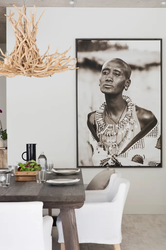 Michelle took the photo of a Masai woman while on holiday in Kenya. Chandelier, dining table, dining chairs, cushion and tray,all from Blupeter Homestore.