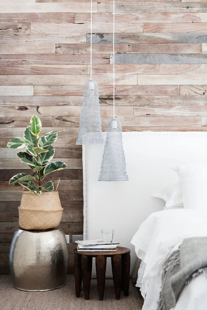 A feature wall of weathered hardwood panelling provides a colour and textural contrast to the room’s predominantly white scheme. The side chair belonged to Michelle’s grandmother.
